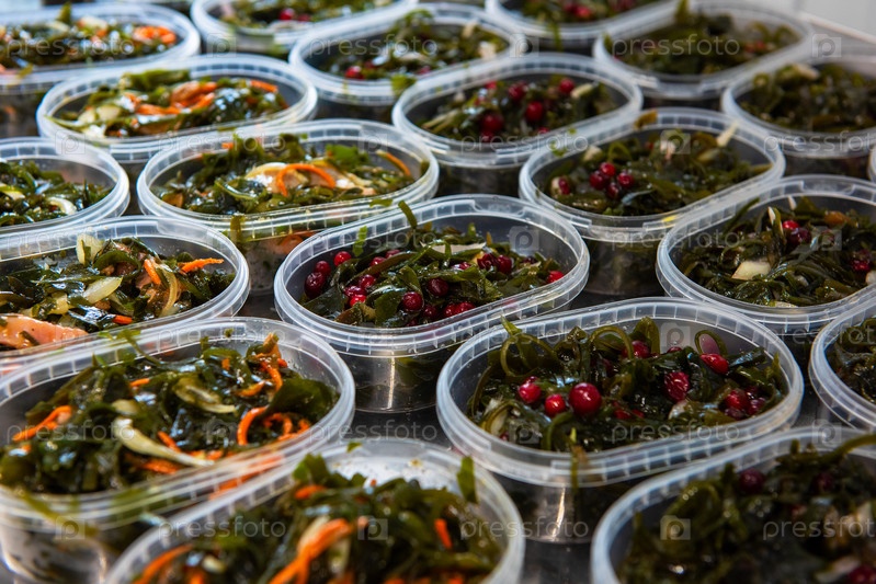 Различные виды рыбы и салат из водорослей чука вакаме ламинария в пластиковых мисках. Концепция производства здоровой пищи или доставки еды