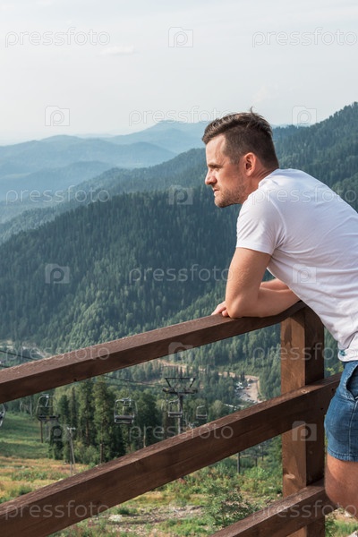 Мужчина стоит и смотрит вдаль в горах