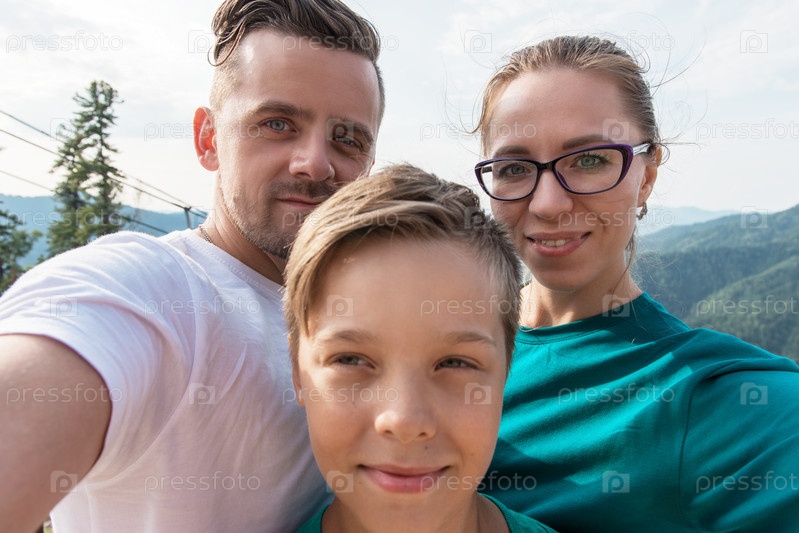 Селфи семьи на Телецком озере в горах Алтая, Сибирь, Россия. Красота летнего дня