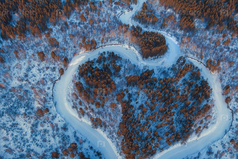 Вид с воздуха на зимний лес в форме сердца