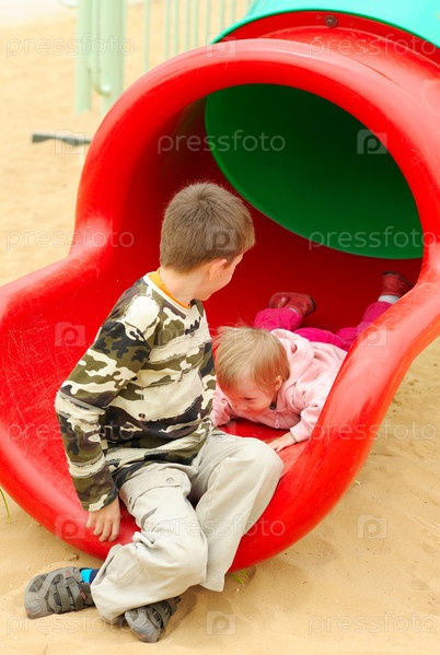 Двое детей, мальчик и девочка, играют на детской площадке