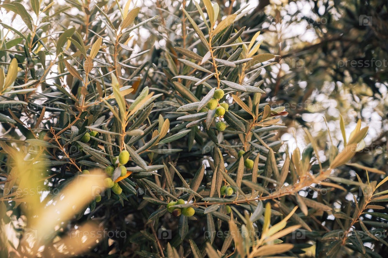 Зеленые оливки, растущие на оливковом дереве, на средиземноморской плантации,