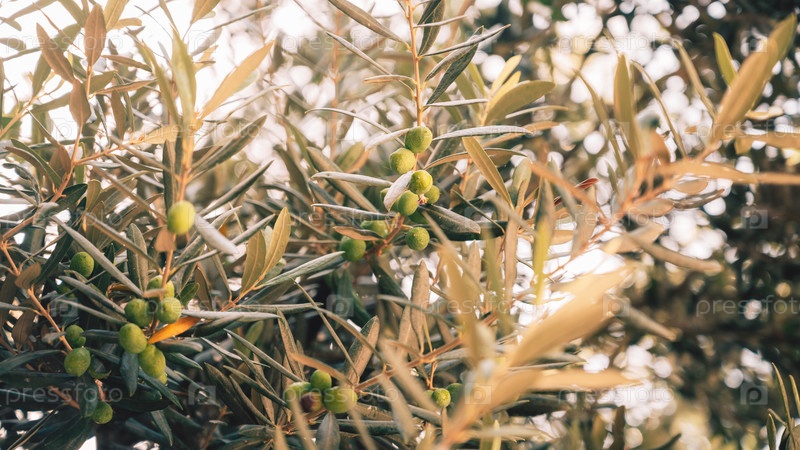 Зеленые оливки, растущие на оливковом дереве, на средиземноморской плантации,
