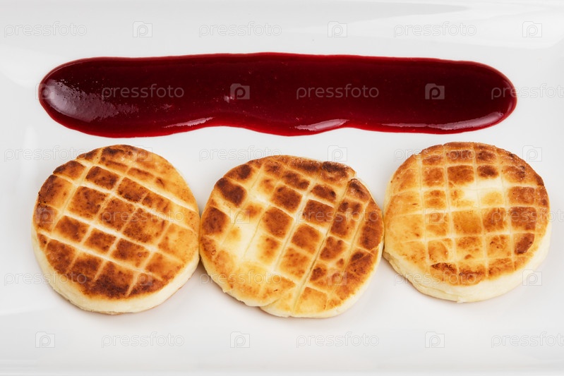 Сырники на темном фоне. Сырники с ягодным джемом на белой тарелке, концепция еды и напитков