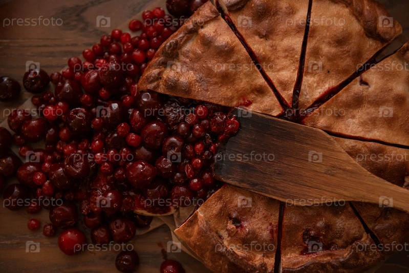 Ягодный пирог со свежими ягодами и вареньем на старинном деревянном фоне. Вид сверху