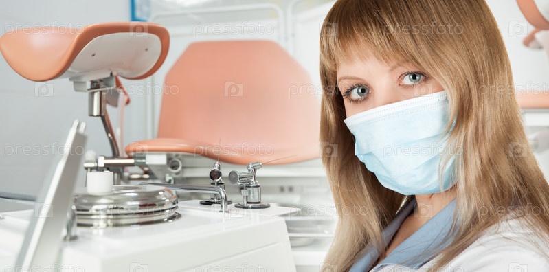 Женщина-гинеколог в защитной маске и белом халате с гинекологическим вагинальным ретрактором в руке