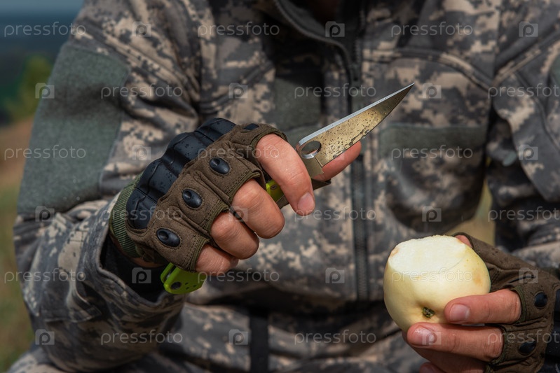 Мужчина с ножом в лесу. Путешествие или военная концепция