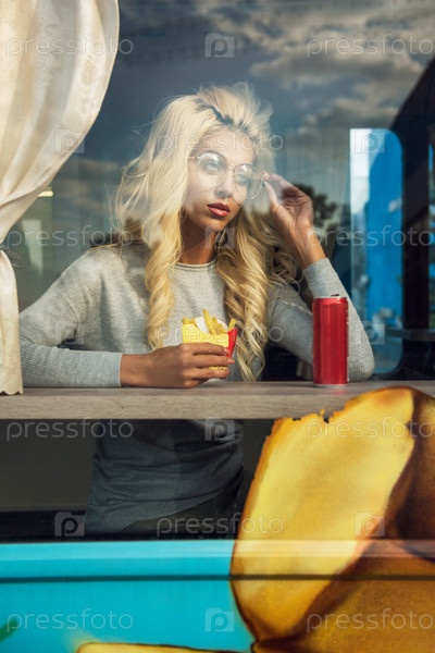 Концепция быстрого питания на улице - красивая молодая блондинка ест бургер и газированную воду в фургоне с едой