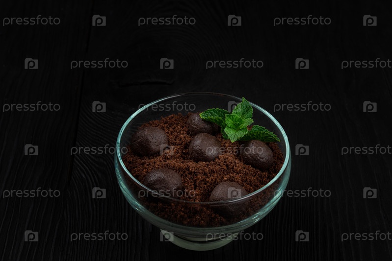 Шоколадный десерт из печенья с кусочками шоколада и мяты на темном деревянном фоне с кописпейсом, концепцией еды и напитков