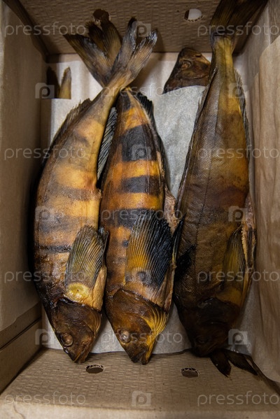 Копченая каменная форель в крафтовой бумажной коробке. Готовое к поставке производство. Концепция производства копченой рыбы