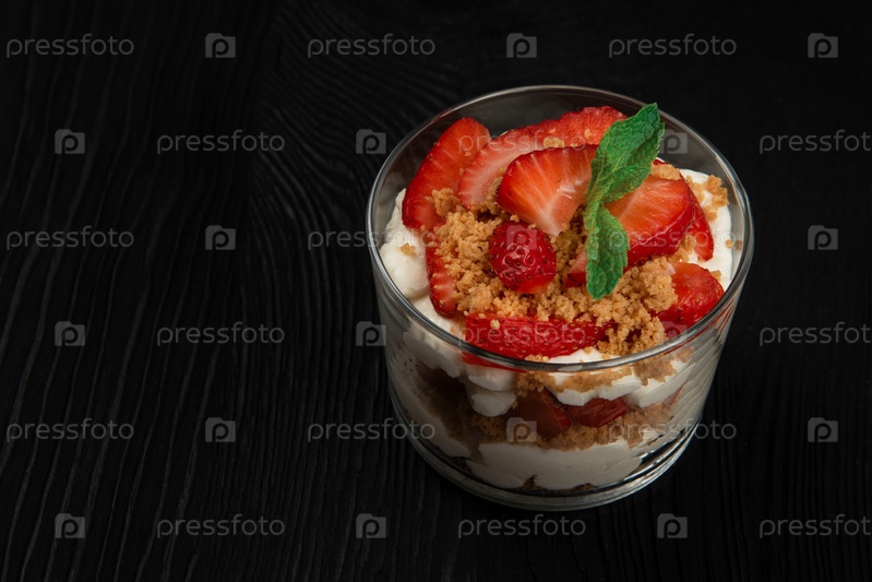 Десерт из клубники с печеньем и сливками, украшенный листком мяты на черном деревянном фоне, с копирайтом, концепцией еды и напитков