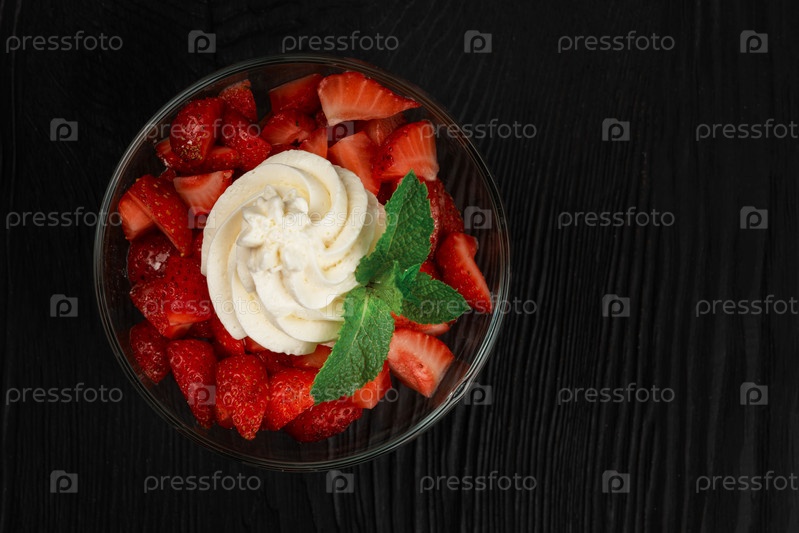 Клубник с сливками, украшенный листьем мяты на черном деревянном фоне, с кописпейсом, концепция еды и напитков
