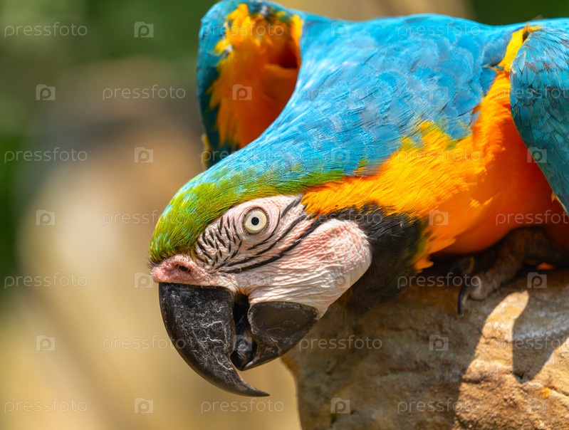 Попугай ара с ярким разноцветным оперением крупным планом