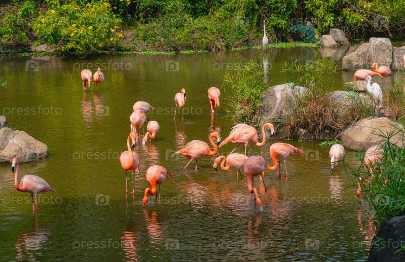 Стая розовых фламинго в красивом тропическом пруду