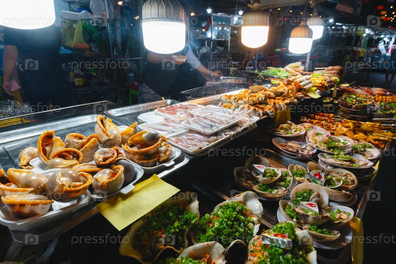 Прилавок с разнообразными деликатесами на ночном рынке во Вьетнаме