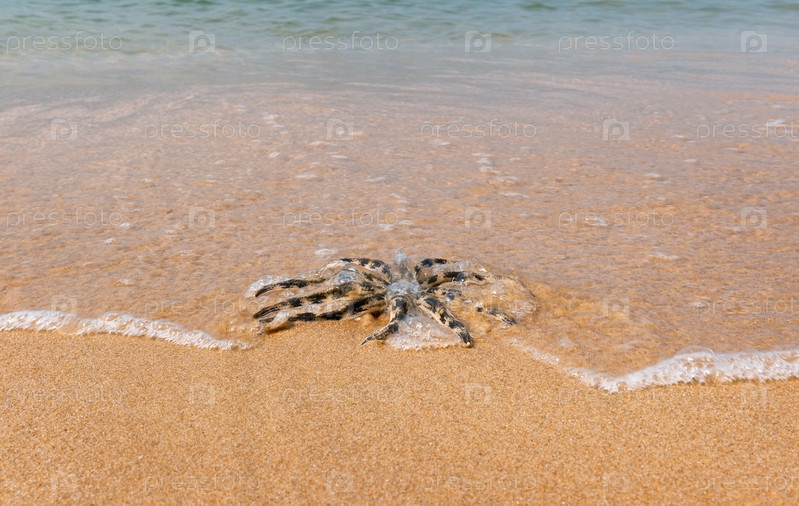 Морская звезда на песчаном пляже у кромки воды