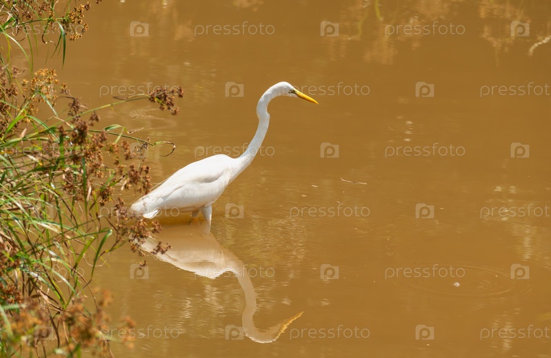 Большая белая цапля Ardea alba в крупном плане в пруду с желтой водой