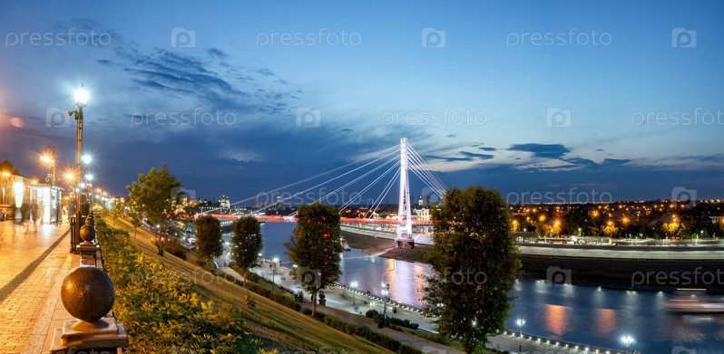 Вид на северную часть Тюмени и мост Влюбленных с берега