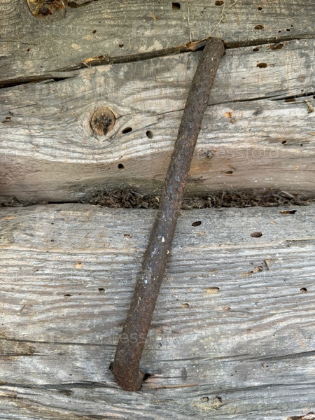 Старая деревянная бревенчатая стена. Бревна соединены металлическим зажимом