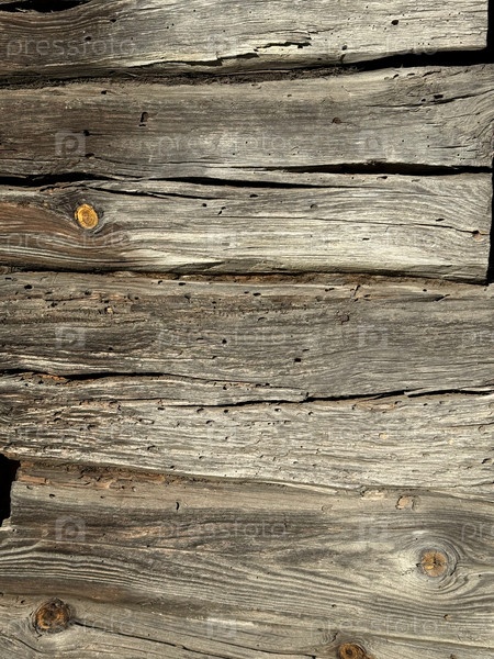 Старая бревенчатая стена. Бревна потрескались и изъедены жуками