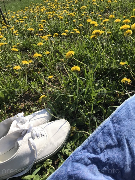 Весенний луг с зеленой травой и желтыми одуванчиками. Есть коврик для отдыха, рядом стоят белые кроссовки