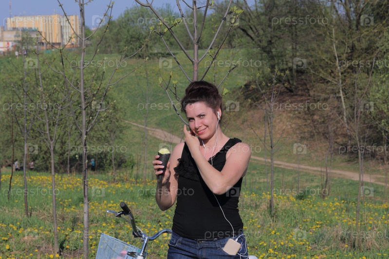 Девочка отдыхает на весенней поляне. Стоит рядом с велосипедом, ест мороженое и слушает музыку. Цветут одуванчики, растет молодая трава