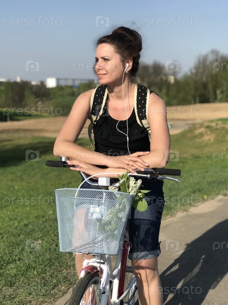 Девушка отдыхает на весенней поляне. Сидит на велосипеде, за спиной туристический рюкзак. Цветут одуванчики, растет молодая трава