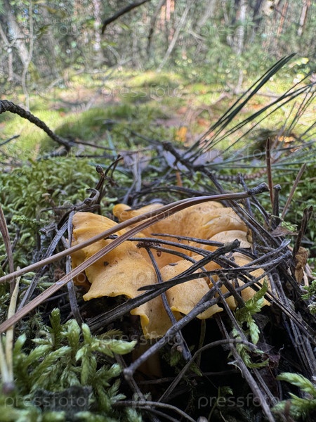 Большая лисичка спрятана во мху в лесу. Съедобный гриб. Крупный план