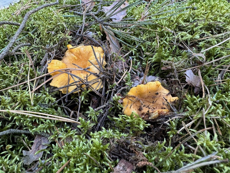 Крупные лисички растут во мху в лесу. Крупный план