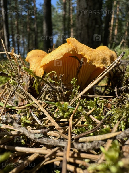 Большая лисичка растет во мху в лесу. Крупный план