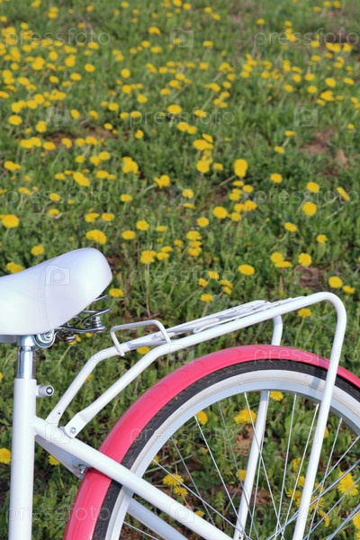 Велосипед стоит на весенней поляне. Цветут одуванчики