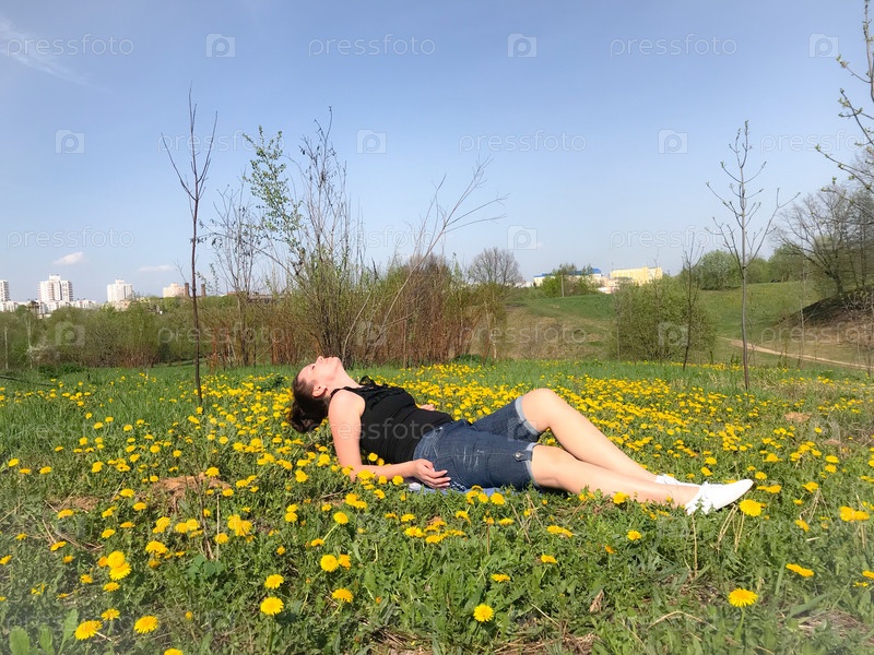 Девочка отдыхает на весеннем лугу. Лежит на покрывале. Цветут одуванчики, растет молодая травка