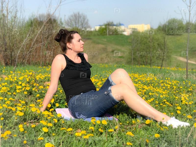 Девочка отдыхает на весеннем лугу. Она сидит на покрывале. Цветут одуванчики, растет молодая трава