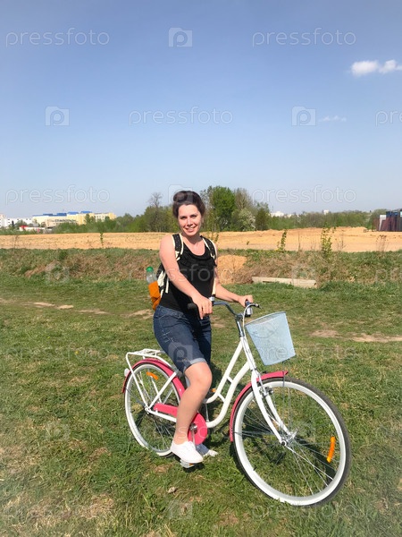 Девушка отдыхает на весенней поляне. Сидит на велосипеде, за спиной туристический рюкзак. Цветут одуванчики, растет молодая трава