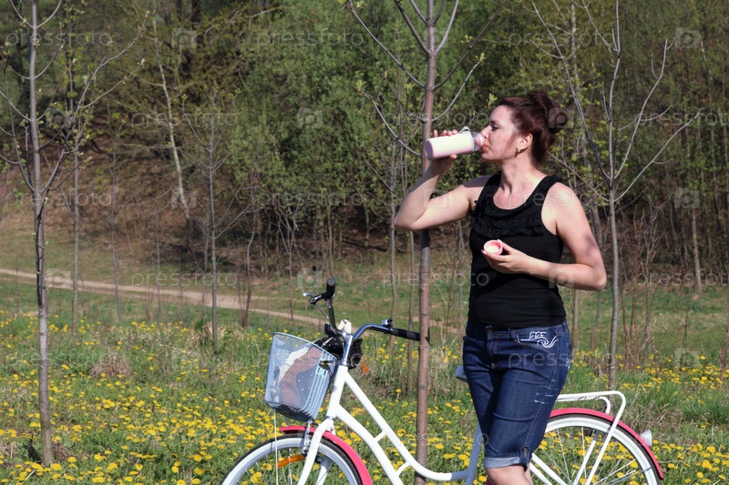 Девочка отдыхает на весенней поляне. Стоит рядом с велосипедом и пьет воду. Цветут одуванчики, растет молодая трава