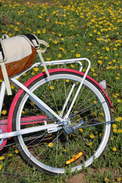 Велосипед стоит на весенней поляне. Рядом туристический рюкзак. Цветут одуванчики