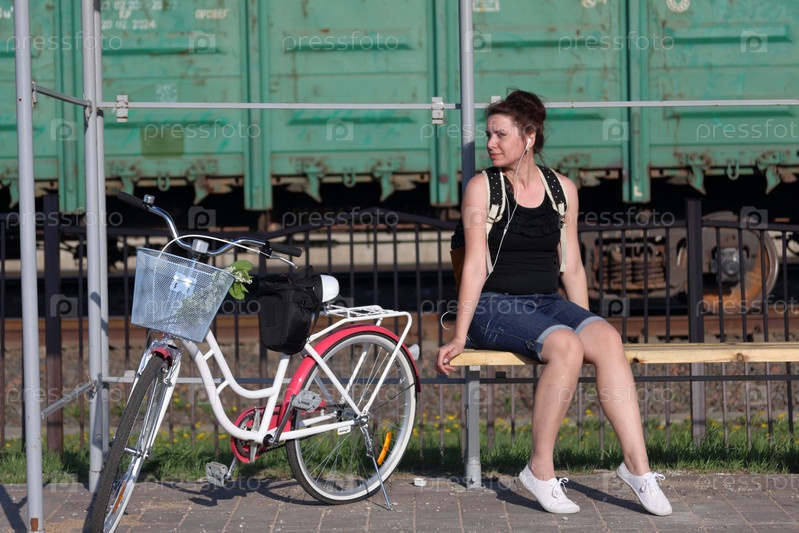 Девушка сидит на скамейке и слушает музыку. Рядом стоит ее велосипед