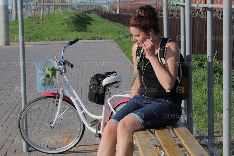 Девушка сидит на скамейке и слушает музыку. Рядом стоит ее велосипед. В корзине — букет цветов