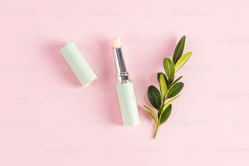 Натуральный бальзам для губ в классической пластиковой упаковке на розовом фоне с веточкой зелени. Концепция увлажнения, питания губ. вид сверху