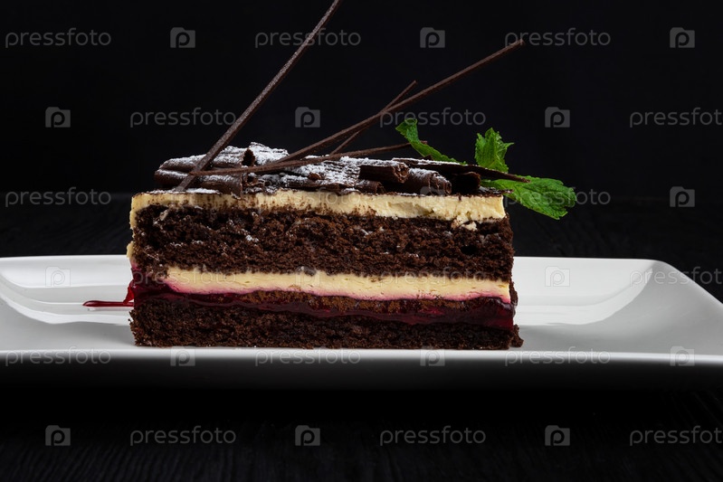 Тарелка с кусочком восхитительного шоколадного торта, украшенная листьями мяты на черном фоне