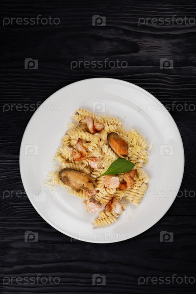 Паста с морепродуктами, мидиями, лососем и креветками с базиликом в белой тарелке на черном деревянном фоне