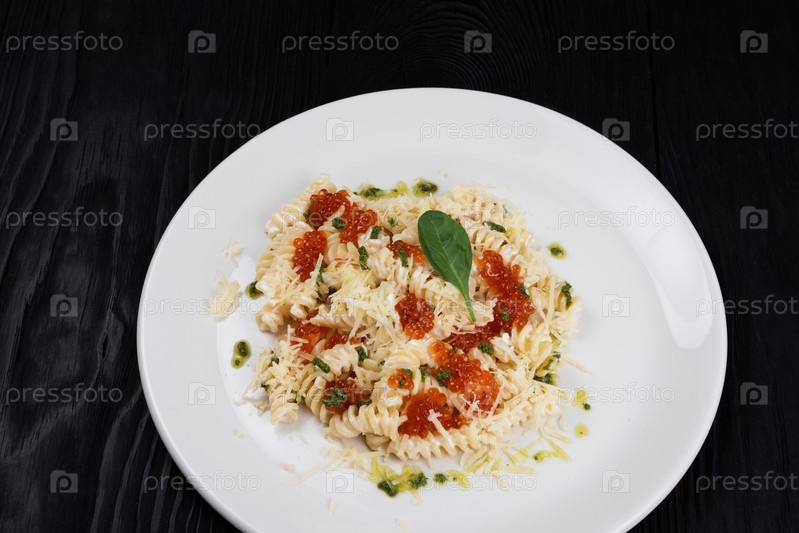 Паста с красной икрой, пармезаном и базиликом. Концепция итальянской кухни