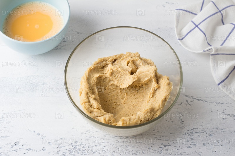 Стеклянная миска с тестом и миска с яйцами на светло-голубом фоне. Этап приготовления домашнего заварного теста