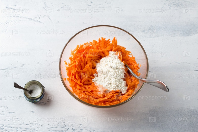 Стеклянная миска с тертой морковью с мукой и солью на светло-сером столе, вид сверху. Готовим домашнюю вегетарианскую еду: морковные блины, оладьи или другую еду