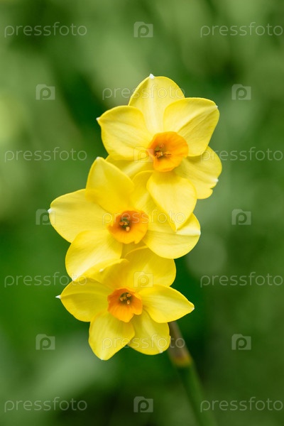 Нарцисс мартинетт на зеленом фоне. Три желтых нарцисса на одном стебле. Красивый садовый цветок