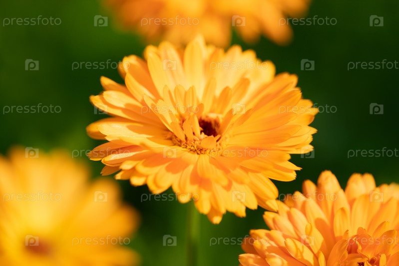 Красивый оранжевый цветок календулы на зеленом фоне. Лекарственное растение. Крупный план, макро