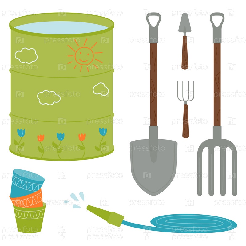 Набор для садоводства и посадки растений — лопата, вилы, садовая бочка, шланг, пустой горшок