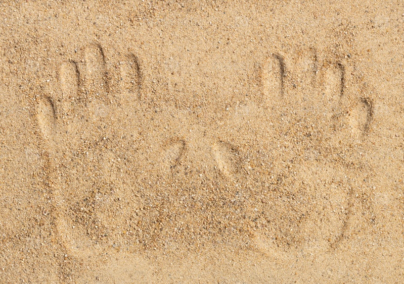 Отпечаток руки на песке. Отпечатки ладони на песчаном пляже. Концепция летних каникул