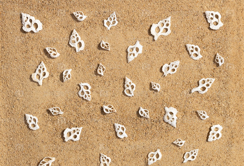 Вырезанные ракушки на песке. Красивые белые ракушки для рукоделия. Фон песчаного пляжа. Вид сверху, плоская планировка