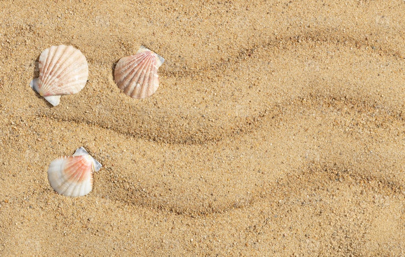 Ракушки на фоне песка с копией пространства. Вид сверху на песчаный пляж с ракушками